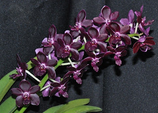 This epiphytic species is endemic to Thailand and occurs around 1200 to 1290 meters. Over twenty flowers and 46 buds on a single inflorescences. The flowers are arranged around dense raceme; sepals dull mahogany; petals ivory; column with long side wing.